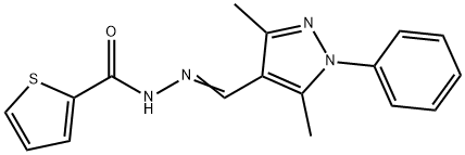 - Synonyms: N'-[(E)-(3,5-dimethyl-1-phenyl-1H-pyrazol-4-yl)methylidene]thiophene-2-carbohydrazide 2-Thiophenecarboxylic acid, 2-[(3,5-dimethyl-1-phenyl-1H-pyrazol-4-yl)methylene]hydrazide N'-((3,5-DIMETHYL-1-PHENYL-1H-PYRAZOL-4-YL)METHYLENE)-2-THIOPHENECARBOHYDRAZIDE N'-((3,5-DIMETHYL-1-PHENYL-1H-PYRAZOL-4-YL)METHYLENE)-2-THIOPHENECARBOHYDRAZIDE
