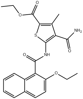 - Synonyms: ethyl 4-(aminocarbonyl)-5-[(2-ethoxy-1-naphthoyl)amino]-3-methyl-2-thiophenecarboxylate 2-Thiophenecarboxylic acid, 4-(aminocarbonyl)-5-[[(2-ethoxy-1-naphthalenyl)carbonyl]amino]-3-methyl-, ethyl ester