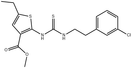 - Synonyms: methyl 2-(3-(3-chlorophenethyl)thioureido)-5-ethylthiophene-3-carboxylate 3-Thiophenecarboxylic acid, 2-[[[[2-(3-chlorophenyl)ethyl]amino]thioxomethyl]amino]-5-ethyl-, methyl ester