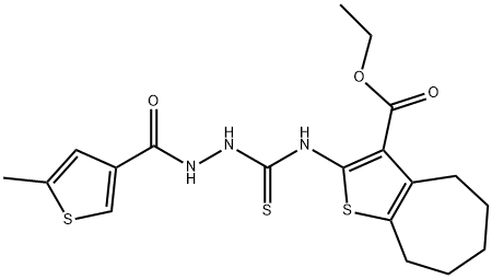 - Synonyms: ethyl 2-(2-(5-methylthiophene-3-carbonyl)hydrazinecarbothioamido)-5,6,7,8-tetrahydro-4H-cyclohepta[b]thiophene-3-carboxylate 4H-Cyclohepta[b]thiophene-3-carboxylic acid, 5,6,7,8-tetrahydro-2-[[[2-[(5-methyl-3-thienyl)carbonyl]hydrazinyl]thioxomethyl]amino]-, ethyl ester