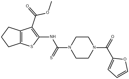 - Synonyms: methyl 2-(4-(furan-2-carbonyl)piperazine-1-carbothioamido)-5,6-dihydro-4H-cyclopenta[b]thiophene-3-carboxylate 4H-Cyclopenta[b]thiophene-3-carboxylic acid, 2-[[[4-(2-furanylcarbonyl)-1-piperazinyl]thioxomethyl]amino]-5,6-dihydro-, methyl ester