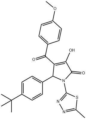 - Synonyms: 5-(4-(tert-butyl)phenyl)-3-hydroxy-4-(4-methoxybenzoyl)-1-(5-methyl-1,3,4-thiadiazol-2-yl)-1H-pyrrol-2(5H)-one 2H-Pyrrol-2-one, 5-[4-(1,1-dimethylethyl)phenyl]-1,5-dihydro-3-hydroxy-4-(4-methoxybenzoyl)-1-(5-methyl-1,3,4-thiadiazol-2-yl)- 5-(4-TERT-BUTYLPHENYL)-3-HYDROXY-4-(4-METHOXYBENZOYL)-1-(5-METHYL-1,3,4-THIADIAZOL-2-YL)-1,5-DIHYDRO-2H-PYRROL-2-ONE