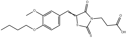 - Synonyms: (E)-3-(5-(4-butoxy-3-methoxybenzylidene)-4-oxo-2-thioxothiazolidin-3-yl)propanoic acid (Z)-3-(5-(4-butoxy-3-methoxybenzylidene)-4-oxo-2-thioxothiazolidin-3-yl)propanoic acid 3-Thiazolidinepropanoic acid, 5-[(4-butoxy-3-methoxyphenyl)methylene]-4-oxo-2-thioxo- 3-[(5E)-5-(4-BUTOXY-3-METHOXYBENZYLIDENE)-4-OXO-2-THIOXO-1,3-THIAZOLIDIN-3-YL]PROPANOIC ACID