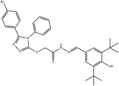 - Synonyms: (E)-2-((5-(4-bromophenyl)-4-phenyl-4H-1,2,4-triazol-3-yl)thio)-N'-(3,5-di-tert-butyl-4-hydroxybenzylidene)acetohydrazide Acetic acid, 2-[[5-(4-bromophenyl)-4-phenyl-4H-1,2,4-triazol-3-yl]thio]-, (2E)-2-[[3,5-bis(1,1-dimethylethyl)-4-hydroxyphenyl]methylene]hydrazide 2-{[5-(4-BROMOPHENYL)-4-PHENYL-4H-1,2,4-TRIAZOL-3-YL]SULFANYL}-N'-[(E)-(3,5-DITERT-BUTYL-4-HYDROXYPHENYL)METHYLIDENE]ACETOHYDRAZIDE 2-{[5-(4-BROMOPHENYL)-4-PHENYL-4H-1,2,4-TRIAZOL-3-YL]SULFANYL}-N'-[(E)-(3,5-DITERT-BUTYL-4-HYDROXYPHENYL)METHYLIDENE]ACETOHYDRAZIDE