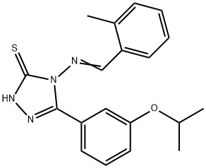 - Synonyms: 4-[(E)-(2-methylphenyl)methylideneamino]-3-(3-propan-2-yloxyphenyl)-1H-1,2,4-triazole-5-thione 3H-1,2,4-Triazole-3-thione, 2,4-dihydro-5-[3-(1-methylethoxy)phenyl]-4-[[(2-methylphenyl)methylene]amino]- 5-(3-ISOPROPOXYPHENYL)-4-{[(E)-(2-METHYLPHENYL)METHYLIDENE]AMINO}-4H-1,2,4-TRIAZOL-3-YL HYDROSULFIDE