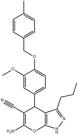 - Synonyms: 6-amino-4-[3-methoxy-4-[(4-methylphenyl)methoxy]phenyl]-3-propyl-2,4-dihydropyrano[2,3-c]pyrazole-5-carbonitrile Pyrano[2,3-c]pyrazole-5-carbonitrile, 6-amino-1,4-dihydro-4-[3-methoxy-4-[(4-methylphenyl)methoxy]phenyl]-3-propyl-
