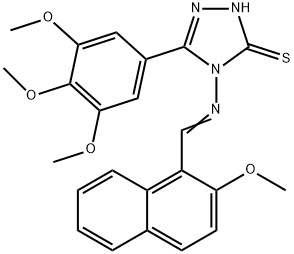 - Synonyms: 4-[(E)-(2-methoxynaphthalen-1-yl)methylideneamino]-3-(3,4,5-trimethoxyphenyl)-1H-1,2,4-triazole-5-thione 3H-1,2,4-Triazole-3-thione, 2,4-dihydro-4-[[(2-methoxy-1-naphthalenyl)methylene]amino]-5-(3,4,5-trimethoxyphenyl)- 4-{[(E)-(2-METHOXY-1-NAPHTHYL)METHYLIDENE]AMINO}-5-(3,4,5-TRIMETHOXYPHENYL)-4H-1,2,4-TRIAZOLE-3-THIOL