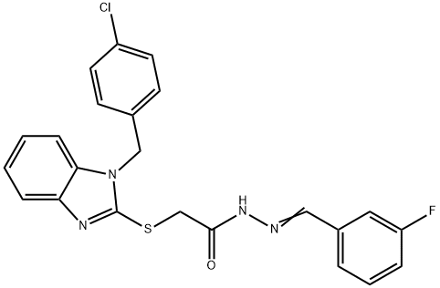 - Synonyms: 2-[1-[(4-chlorophenyl)methyl]benzimidazol-2-yl]sulfanyl-N-[(E)-(3-fluorophenyl)methylideneamino]acetamide Acetic acid, 2-[[1-[(4-chlorophenyl)methyl]-1H-benzimidazol-2-yl]thio]-, 2-[(3-fluorophenyl)methylene]hydrazide 2-((1-(4-CL-BENZYL)-1H-BENZIMIDAZOL-2-YL)THIO)N'-(3-F-BENZYLIDENE)ACETOHYDRAZIDE 2-((1-(4-CL-BENZYL)-1H-BENZIMIDAZOL-2-YL)THIO)N'-(3-F-BENZYLIDENE)ACETOHYDRAZIDE