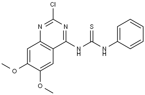 - Synonyms: N-(2-CHLORO-6,7-DIMETHOXY-4-QUINAZOLINYL)-N'-PHENYLTHIOUREA Thiourea, N-(2-chloro-6,7-dimethoxy-4-quinazolinyl)-N′-phenyl- N-(2-CHLORO-6,7-DIMETHOXY-4-QUINAZOLINYL)-N'-PHENYLTHIOUREA