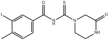 - Synonyms: 3-iodo-4-methyl-N-[(3-oxo-1-piperazinyl)carbonothioyl]benzamide 3-iodo-4-methyl-N-(3-oxopiperazine-1-carbothioyl)benzamide Benzamide, 3-iodo-4-methyl-N-[(3-oxo-1-piperazinyl)thioxomethyl]-