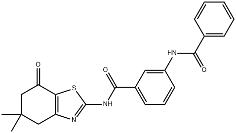 - Synonyms: 3-benzamido-N-(5,5-dimethyl-7-oxo-4,6-dihydro-1,3-benzothiazol-2-yl)benzamide Benzamide, 3-(benzoylamino)-N-(4,5,6,7-tetrahydro-5,5-dimethyl-7-oxo-2-benzothiazolyl)-