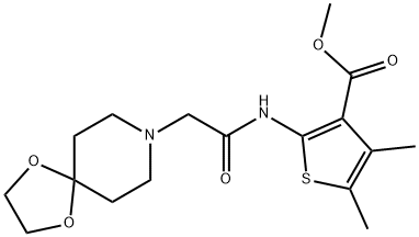 - Synonyms: methyl 2-(2-(1,4-dioxa-8-azaspiro[4.5]decan-8-yl)acetamido)-4,5-dimethylthiophene-3-carboxylate 3-Thiophenecarboxylic acid, 2-[[2-(1,4-dioxa-8-azaspiro[4.5]dec-8-yl)acetyl]amino]-4,5-dimethyl-, methyl ester