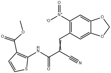 - Synonyms: (Z)-methyl 2-(2-cyano-3-(6-nitrobenzo[d][1,3]dioxol-5-yl)acrylamido)thiophene-3-carboxylate 3-Thiophenecarboxylic acid, 2-[[2-cyano-3-(6-nitro-1,3-benzodioxol-5-yl)-1-oxo-2-propen-1-yl]amino]-, methyl ester