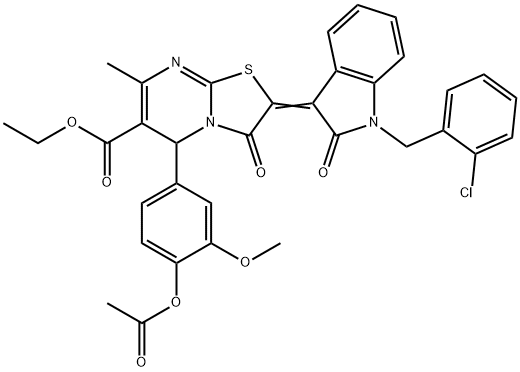- Synonyms: 5H-Thiazolo[3,2-a]pyrimidine-6-carboxylic acid, 5-[4-(acetyloxy)-3-methoxyphenyl]-2-[1-[(2-chlorophenyl)methyl]-1,2-dihydro-2-oxo-3H-indol-3-ylidene]-2,3-dihydro-7-methyl-3-oxo-, ethyl ester (Z)-ethyl 5-(4-acetoxy-3-methoxyphenyl)-2-(1-(2-chlorobenzyl)-2-oxoindolin-3-ylidene)-7-methyl-3-oxo-3,5-dihydro-2H-thiazolo[3,2-a]pyrimidine-6-carboxylate ETHYL (2Z)-5-[4-(ACETYLOXY)-3-METHOXYPHENYL]-2-[1-(2-CHLOROBENZYL)-2-OXO-1,2-DIHYDRO-3H-INDOL-3-YLIDENE]-7-METHYL-3-OXO-2,3-DIHYDRO-5H-[1,3]THIAZOLO[3,2-A]PYRIMIDINE-6-CARBOXYLATE