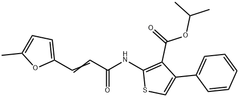 - Synonyms: propan-2-yl 2-[[(E)-3-(5-methylfuran-2-yl)prop-2-enoyl]amino]-4-phenylthiophene-3-carboxylate 3-Thiophenecarboxylic acid, 2-[[3-(5-methyl-2-furanyl)-1-oxo-2-propen-1-yl]amino]-4-phenyl-, 1-methylethyl ester