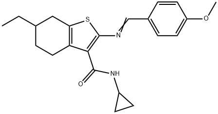 - Synonyms: Benzo[b]thiophene-3-carboxamide, N-cyclopropyl-6-ethyl-4,5,6,7-tetrahydro-2-[[(4-methoxyphenyl)methylene]amino]- N-cyclopropyl-6-ethyl-2-[(E)-(4-methoxyphenyl)methylideneamino]-4,5,6,7-tetrahydro-1-benzothiophene-3-carboxamide