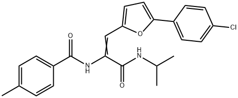 - 英文同义词: N-[(E)-1-[5-(4-chlorophenyl)furan-2-yl]-3-oxo-3-(propan-2-ylamino)prop-1-en-2-yl]-4-methylbenzamide Benzamide, N-[2-[5-(4-chlorophenyl)-2-furanyl]-1-[[(1-methylethyl)amino]carbonyl]ethenyl]-4-methyl- N-(2-(5-(4-CL-PH)-2-FURYL)-1-((ISOPROPYLAMINO)CARBONYL)VINYL)-4-METHYLBENZAMIDE