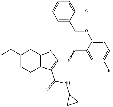 - Synonyms: Benzo[b]thiophene-3-carboxamide, 2-[[[5-bromo-2-[(2-chlorophenyl)methoxy]phenyl]methylene]amino]-N-cyclopropyl-6-ethyl-4,5,6,7-tetrahydro- 2-[(E)-[5-bromo-2-[(2-chlorophenyl)methoxy]phenyl]methylideneamino]-N-cyclopropyl-6-ethyl-4,5,6,7-tetrahydro-1-benzothiophene-3-carboxamide