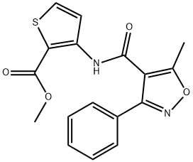 - Synonyms: methyl 3-[(5-methyl-3-phenyl-1,2-oxazole-4-carbonyl)amino]thiophene-2-carboxylate 2-Thiophenecarboxylic acid, 3-[[(5-methyl-3-phenyl-4-isoxazolyl)carbonyl]amino]-, methyl ester