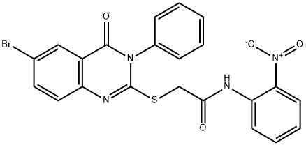 - Synonyms: 2-(6-bromo-4-oxo-3-phenylquinazolin-2-yl)sulfanyl-N-(2-nitrophenyl)acetamide Acetamide, 2-[(6-bromo-3,4-dihydro-4-oxo-3-phenyl-2-quinazolinyl)thio]-N-(2-nitrophenyl)-