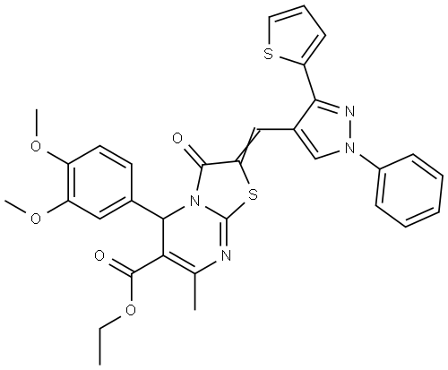 - Synonyms: ETHYL (2E)-5-(3,4-DIMETHOXYPHENYL)-7-METHYL-3-OXO-2-{[1-PHENYL-3-(2-THIENYL)-1H-PYRAZOL-4-YL]METHYLENE}-2,3-DIHYDRO-5H-[1,3]THIAZOLO[3,2-A]PYRIMIDINE-6-CARBOXYLATE 5H-Thiazolo[3,2-a]pyrimidine-6-carboxylic acid, 5-(3,4-dimethoxyphenyl)-2,3-dihydro-7-methyl-3-oxo-2-[[1-phenyl-3-(2-thienyl)-1H-pyrazol-4-yl]methylene]-, ethyl ester