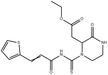 - Synonyms: ethyl [3-oxo-1-({[3-(2-thienyl)acryloyl]amino}carbonothioyl)-2-piperazinyl]acetate ethyl (3-oxo-1-{[(2E)-3-(thiophen-2-yl)prop-2-enoyl]carbamothioyl}piperazin-2-yl)acetate 2-Piperazineacetic acid, 3-oxo-1-[[[1-oxo-3-(2-thienyl)-2-propen-1-yl]amino]thioxomethyl]-, ethyl ester