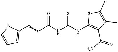 - Synonyms: 4,5-dimethyl-2-[({[3-(2-thienyl)acryloyl]amino}carbonothioyl)amino]-3-thiophenecarboxamide 4,5-dimethyl-2-({[(2E)-3-(thiophen-2-yl)prop-2-enoyl]carbamothioyl}amino)thiophene-3-carboxamide 3-Thiophenecarboxamide, 4,5-dimethyl-2-[[[[1-oxo-3-(2-thienyl)-2-propen-1-yl]amino]thioxomethyl]amino]-