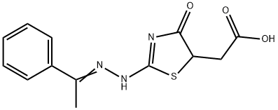 - Synonyms: {4-oxo-2-[(1-phenylethylidene)hydrazono]-1,3-thiazolidin-5-yl}acetic acid 5-Thiazoleacetic acid, 4,5-dihydro-4-oxo-2-[2-(1-phenylethylidene)hydrazinyl]- (4-OXO-2-((1-PHENYL-ETHYLIDENE)-HYDRAZONO)-THIAZOLIDIN-5-YL)-ACETIC ACID