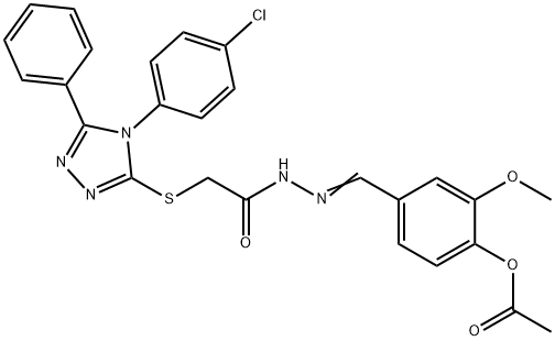 - Synonyms: (E)-4-((2-(2-((4-(4-chlorophenyl)-5-phenyl-4H-1,2,4-triazol-3-yl)thio)acetyl)hydrazono)methyl)-2-methoxyphenyl acetate Acetic acid, 2-[[4-(4-chlorophenyl)-5-phenyl-4H-1,2,4-triazol-3-yl]thio]-, 2-[[4-(acetyloxy)-3-methoxyphenyl]methylene]hydrazide 4-{(E)-[({[4-(4-CHLOROPHENYL)-5-PHENYL-4H-1,2,4-TRIAZOL-3-YL]SULFANYL}ACETYL)HYDRAZONO]METHYL}-2-METHOXYPHENYL ACETATE