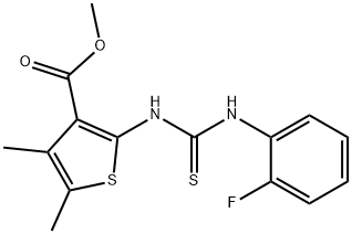- Synonyms: methyl 2-(3-(2-fluorophenyl)thioureido)-4,5-dimethylthiophene-3-carboxylate 3-Thiophenecarboxylic acid, 2-[[[(2-fluorophenyl)amino]thioxomethyl]amino]-4,5-dimethyl-, methyl ester