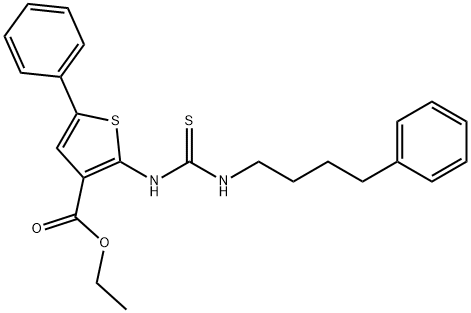 - Synonyms: ethyl 5-phenyl-2-(3-(4-phenylbutyl)thioureido)thiophene-3-carboxylate 3-Thiophenecarboxylic acid, 5-phenyl-2-[[[(4-phenylbutyl)amino]thioxomethyl]amino]-, ethyl ester