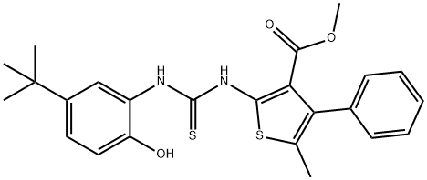 - Synonyms: methyl 2-(3-(5-(tert-butyl)-2-hydroxyphenyl)thioureido)-5-methyl-4-phenylthiophene-3-carboxylate 3-Thiophenecarboxylic acid, 2-[[[[5-(1,1-dimethylethyl)-2-hydroxyphenyl]amino]thioxomethyl]amino]-5-methyl-4-phenyl-, methyl ester