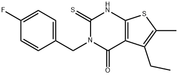- Synonyms: 5-ethyl-3-[(4-fluorophenyl)methyl]-6-methyl-2-sulfanylidene-1H-thieno[2,3-d]pyrimidin-4-one Thieno[2,3-d]pyrimidin-4(1H)-one, 5-ethyl-3-[(4-fluorophenyl)methyl]-2,3-dihydro-6-methyl-2-thioxo-