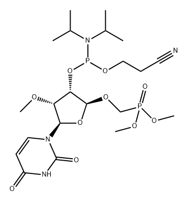 - Synonyms: Phosphonic acid, P-[[[(2R,3S,4R,5R)-3-[[[bis(1-methylethyl)amino](2-cyanoethoxy)phosphino]oxy]-5-(3,4-dihydro-2,4-dioxo-1(2H)-pyrimidinyl)tetrahydro-4-methoxy-2-furanyl]oxy]methyl]-, dimethyl ester 2-cyanoethyl ((2R,3S,4R,5R) -2-((dimethoxyphosphoryl) methoxy)-5-(2,4R)-2-((dimethoxyphosphoryl)methoxy)-5-(2,4-dioxo-3,4-dihydropyrimidin-1(2H)-yl)-4-methoxytetrahydrofuran-3-yl) diisopropylamino phosphoramidite, MeMOP 2-Cyanoethyl [(2R,3S,4R,5R)-2-[(Dimethoxyphosphoryl)methoxy]-5-[2,4-dioxo-3,4-dihydropyrimidin-1(2H)-yl]-4-methoxytetrahydrofuran-3-yl] Diisopropylphosphoramidite 4'-0-(dimethoxyphosphoryl)methyl-2'0-Me-U-3'-cE-phosphoramidite