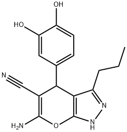 - Synonyms: 6-amino-4-(3,4-dihydroxyphenyl)-3-propyl-1,4-dihydropyrano[2,3-c]pyrazole-5-carbonitrile Pyrano[2,3-c]pyrazole-5-carbonitrile, 6-amino-4-(3,4-dihydroxyphenyl)-1,4-dihydro-3-propyl- 6-AMINO-4-(3,4-DI-HO-PH)-3-PR-1,4-DIHYDROPYRANO(2,3-C)PYRAZOLE-5-CARBONITRILE