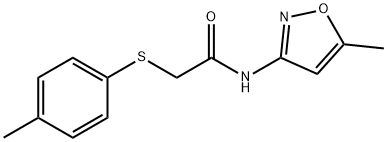 - Synonyms: N-(5-methylisoxazol-3-yl)-2-(p-tolylthio)acetamide N-(5-methyl-1,2-oxazol-3-yl)-2-[(4-methylphenyl)sulfanyl]acetamide Acetamide, N-(5-methyl-3-isoxazolyl)-2-[(4-methylphenyl)thio]-