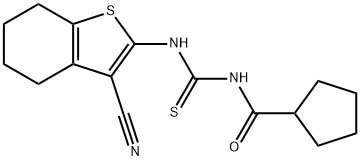 - Synonyms: N-[(3-cyano-4,5,6,7-tetrahydro-1-benzothiophen-2-yl)carbamothioyl]cyclopentanecarboxamide N-(3-cyano-4,5,6,7-tetrahydro-1-benzothien-2-yl)-N'-(cyclopentylcarbonyl)thiourea N-{[(3-cyano-4,5,6,7-tetrahydro-1-benzothien-2-yl)amino]carbonothioyl}cyclopentanecarboxamide Cyclopentanecarboxamide, N-[[(3-cyano-4,5,6,7-tetrahydrobenzo[b]thien-2-yl)amino]thioxomethyl]-