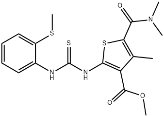- Synonyms: methyl 5-(dimethylcarbamoyl)-4-methyl-2-(3-(2-(methylthio)phenyl)thioureido)thiophene-3-carboxylate 3-Thiophenecarboxylic acid, 5-[(dimethylamino)carbonyl]-4-methyl-2-[[[[2-(methylthio)phenyl]amino]thioxomethyl]amino]-, methyl ester