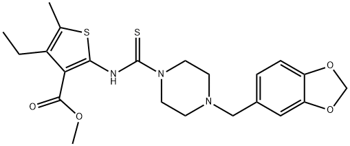 - Synonyms: methyl 2-(4-(benzo[d][1,3]dioxol-5-ylmethyl)piperazine-1-carbothioamido)-4-ethyl-5-methylthiophene-3-carboxylate 3-Thiophenecarboxylic acid, 2-[[[4-(1,3-benzodioxol-5-ylmethyl)-1-piperazinyl]thioxomethyl]amino]-4-ethyl-5-methyl-, methyl ester