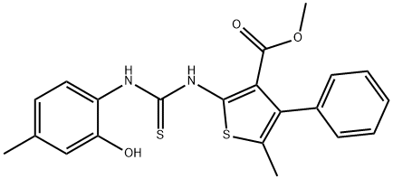 - Synonyms: methyl 2-(3-(2-hydroxy-4-methylphenyl)thioureido)-5-methyl-4-phenylthiophene-3-carboxylate 3-Thiophenecarboxylic acid, 2-[[[(2-hydroxy-4-methylphenyl)amino]thioxomethyl]amino]-5-methyl-4-phenyl-, methyl ester