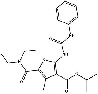 - Synonyms: propan-2-yl 5-(diethylcarbamoyl)-4-methyl-2-(phenylcarbamoylamino)thiophene-3-carboxylate 3-Thiophenecarboxylic acid, 5-[(diethylamino)carbonyl]-4-methyl-2-[[(phenylamino)carbonyl]amino]-, 1-methylethyl ester