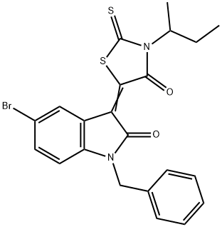 - Synonyms: (5Z)-5-(1-benzyl-5-bromo-2-oxoindol-3-ylidene)-3-butan-2-yl-2-sulfanylidene-1,3-thiazolidin-4-one 2H-Indol-2-one, 5-bromo-1,3-dihydro-3-[3-(1-methylpropyl)-4-oxo-2-thioxo-5-thiazolidinylidene]-1-(phenylmethyl)- (3Z)-1-BENZYL-5-BROMO-3-(3-SEC-BUTYL-4-OXO-2-THIOXO-1,3-THIAZOLIDIN-5-YLIDENE)-1,3-DIHYDRO-2H-INDOL-2-ONE