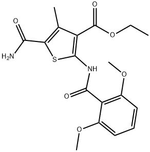 - Synonyms: ethyl 5-carbamoyl-2-[(2,6-dimethoxybenzoyl)amino]-4-methylthiophene-3-carboxylate 3-Thiophenecarboxylic acid, 5-(aminocarbonyl)-2-[(2,6-dimethoxybenzoyl)amino]-4-methyl-, ethyl ester