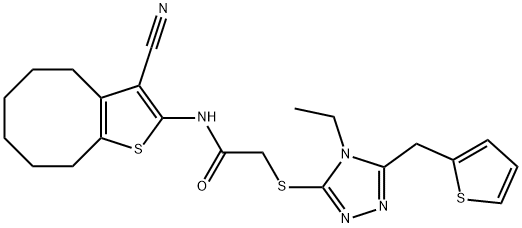 - Synonyms: N-(3-cyano-4,5,6,7,8,9-hexahydrocycloocta[b]thiophen-2-yl)-2-[[4-ethyl-5-(thiophen-2-ylmethyl)-1,2,4-triazol-3-yl]sulfanyl]acetamide Acetamide, N-(3-cyano-4,5,6,7,8,9-hexahydrocycloocta[b]thien-2-yl)-2-[[4-ethyl-5-(2-thienylmethyl)-4H-1,2,4-triazol-3-yl]thio]-