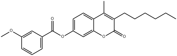 - Synonyms: (3-hexyl-4-methyl-2-oxochromen-7-yl) 3-methoxybenzoate Benzoic acid, 3-methoxy-, 3-hexyl-4-methyl-2-oxo-2H-1-benzopyran-7-yl ester