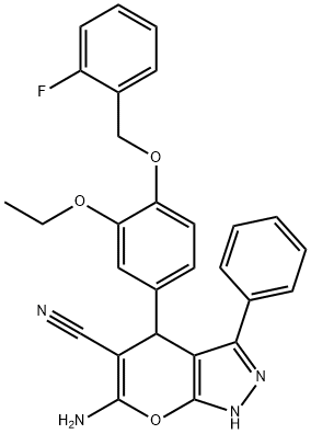 - Synonyms: 6-amino-4-[3-ethoxy-4-[(2-fluorophenyl)methoxy]phenyl]-3-phenyl-2,4-dihydropyrano[2,3-c]pyrazole-5-carbonitrile Pyrano[2,3-c]pyrazole-5-carbonitrile, 6-amino-4-[3-ethoxy-4-[(2-fluorophenyl)methoxy]phenyl]-1,4-dihydro-3-phenyl-