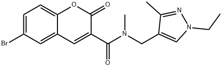 - Synonyms: 6-bromo-N-[(1-ethyl-3-methylpyrazol-4-yl)methyl]-N-methyl-2-oxochromene-3-carboxamide 2H-1-Benzopyran-3-carboxamide, 6-bromo-N-[(1-ethyl-3-methyl-1H-pyrazol-4-yl)methyl]-N-methyl-2-oxo-