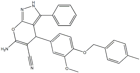- Synonyms: 6-amino-4-[3-methoxy-4-[(4-methylphenyl)methoxy]phenyl]-3-phenyl-2,4-dihydropyrano[2,3-c]pyrazole-5-carbonitrile