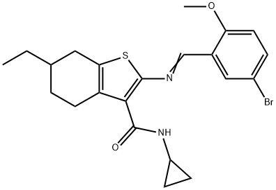 - Synonyms: 2-[(E)-(5-bromo-2-methoxyphenyl)methylideneamino]-N-cyclopropyl-6-ethyl-4,5,6,7-tetrahydro-1-benzothiophene-3-carboxamide Benzo[b]thiophene-3-carboxamide, 2-[[(5-bromo-2-methoxyphenyl)methylene]amino]-N-cyclopropyl-6-ethyl-4,5,6,7-tetrahydro-