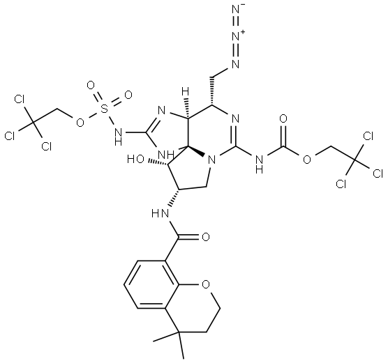 - Synonyms: 2,2,2-trichloroethyl ((3aS,4S,9S,10S,10aS)-4-(azidomethyl)-9-(4,4-dimethylchromane-8-carboxamido)-10-hydroxy-6-(((2,2,2-trichloroethoxy)carbonyl)imino)hexahydro-1H,8H-pyrrolo[1,2-c]purin-2(3H)-ylidene)sulfamate Sulfamic acid, N-[(3aS,4S,9S,10S,10aS)-4-(azidomethyl)-9-[[(3,4-dihydro-4,4-dimethyl-2H-1-benzopyran-8-yl)carbonyl]amino]-3a,4,9,10-tetrahydro-10-hydroxy-6-[[(2,2,2-trichloroethoxy)carbonyl]amino]-1H,8H-pyrrolo[1,2-c]purin-2-yl]-, 2,2,2-trichloroethyl ester